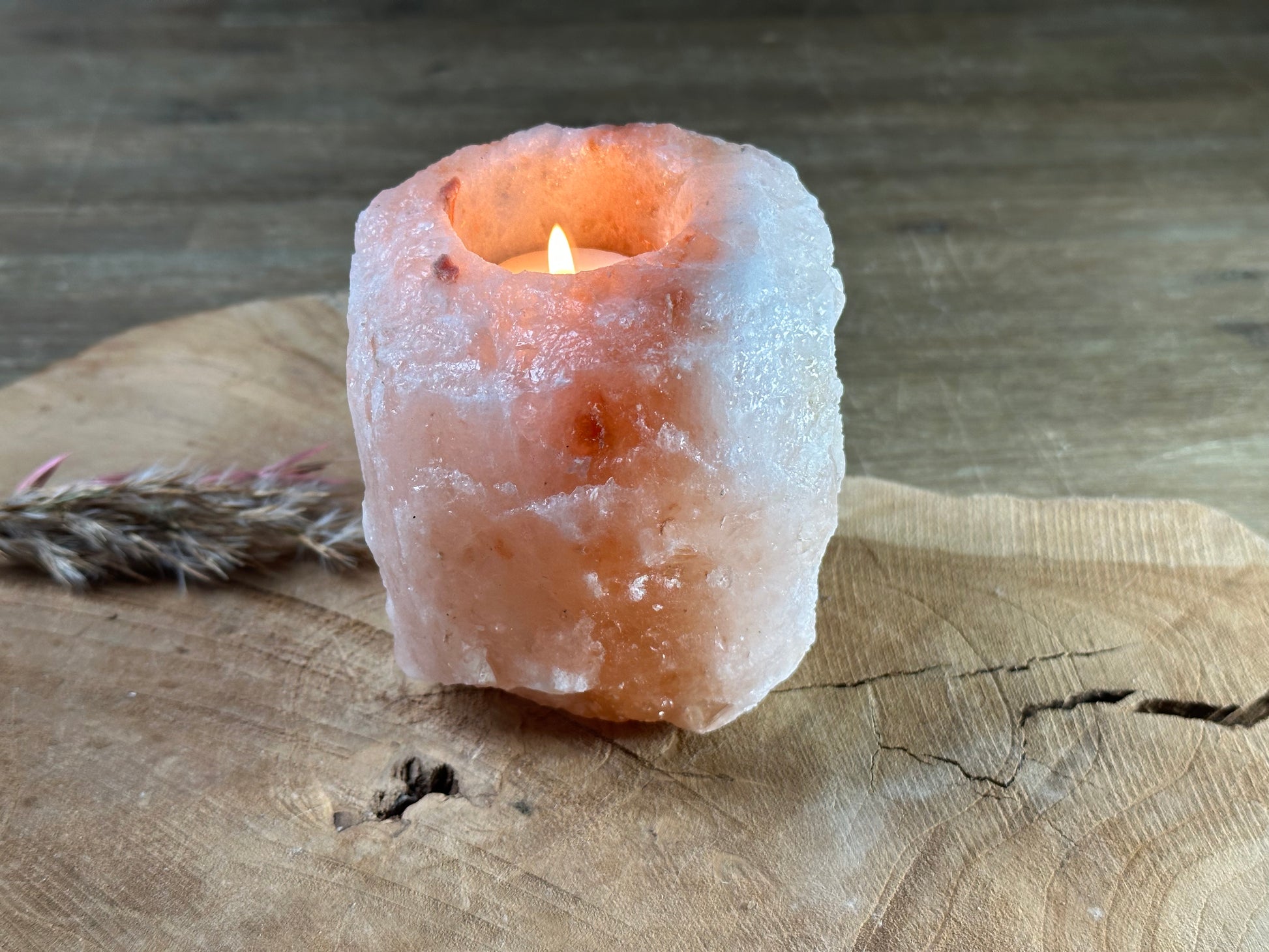 Mooie waxinelichthouder van zoutsteen. Gewicht 1-1,5 kg en ongeveer 15 cm hoog.