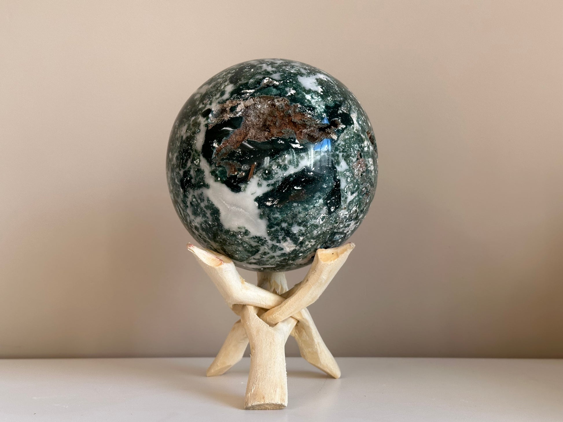 Prachtige bol van mosagaat. Met een diameter van 13 cm en een gewicht van bijna 3 kilo heb je hier een prachtige aanwinst op alle fronten.