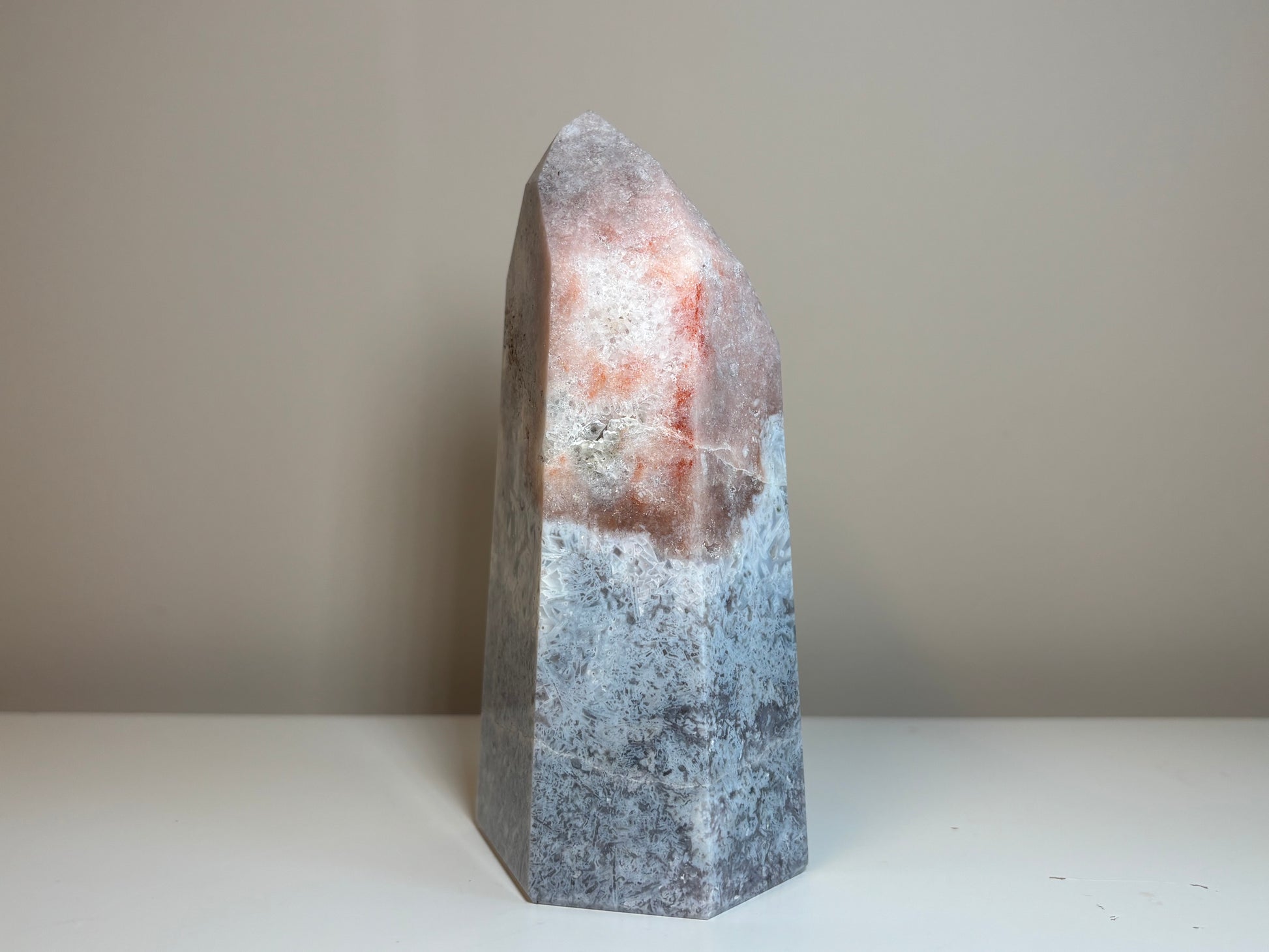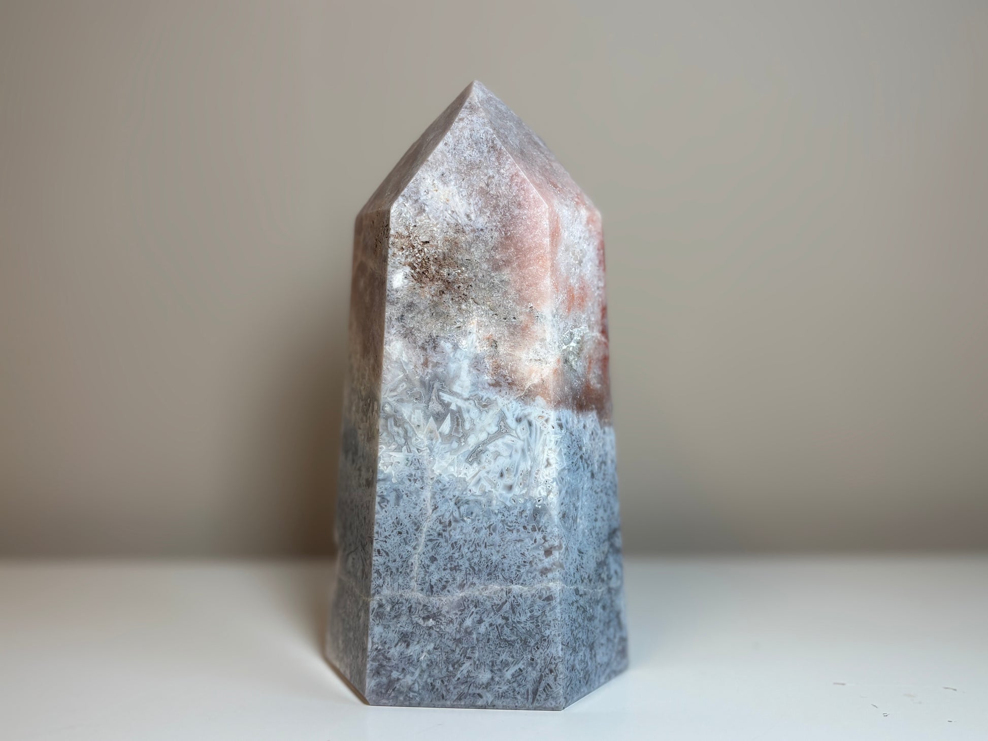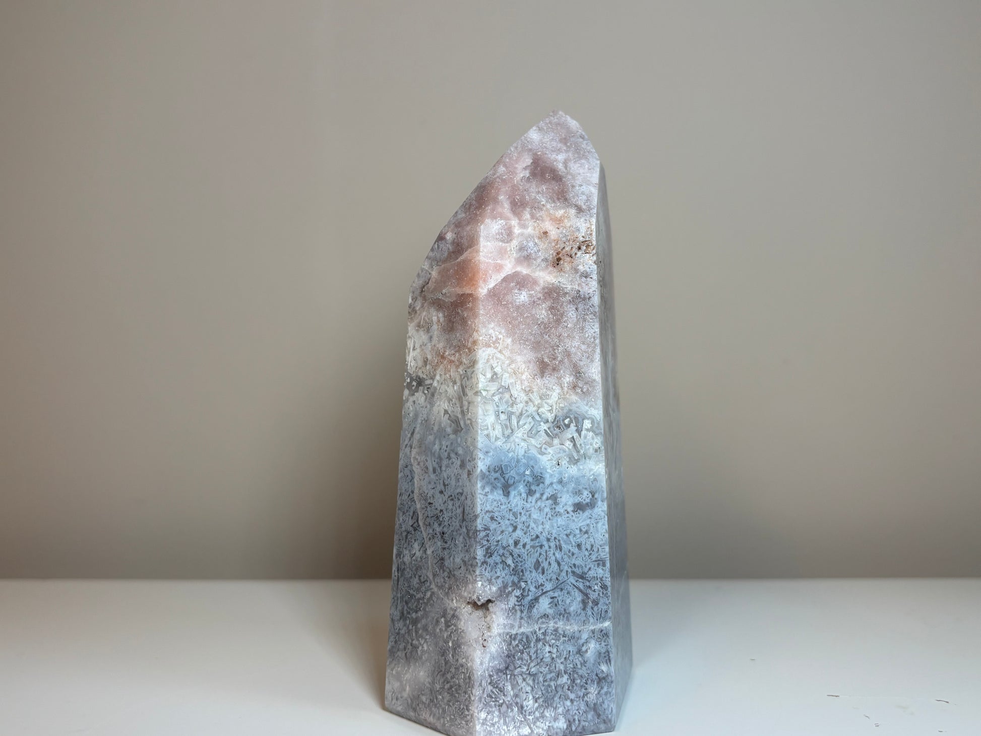 Prachtige roze amethist obelisk van circa, 765 gram, 14 cm hoog en 7 cm breed.