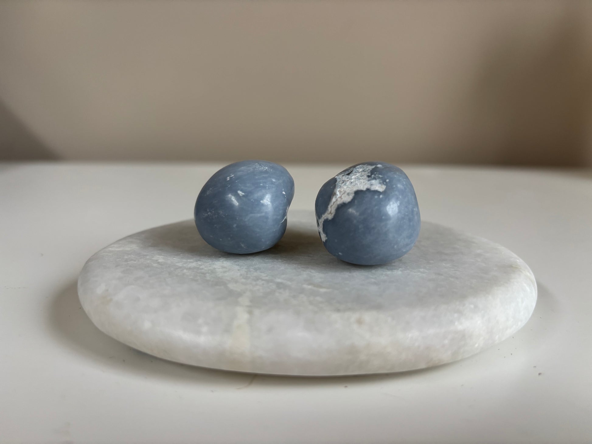 Mooie kwaliteit trommelstenen van angeliet, een 'Engelensteen'.