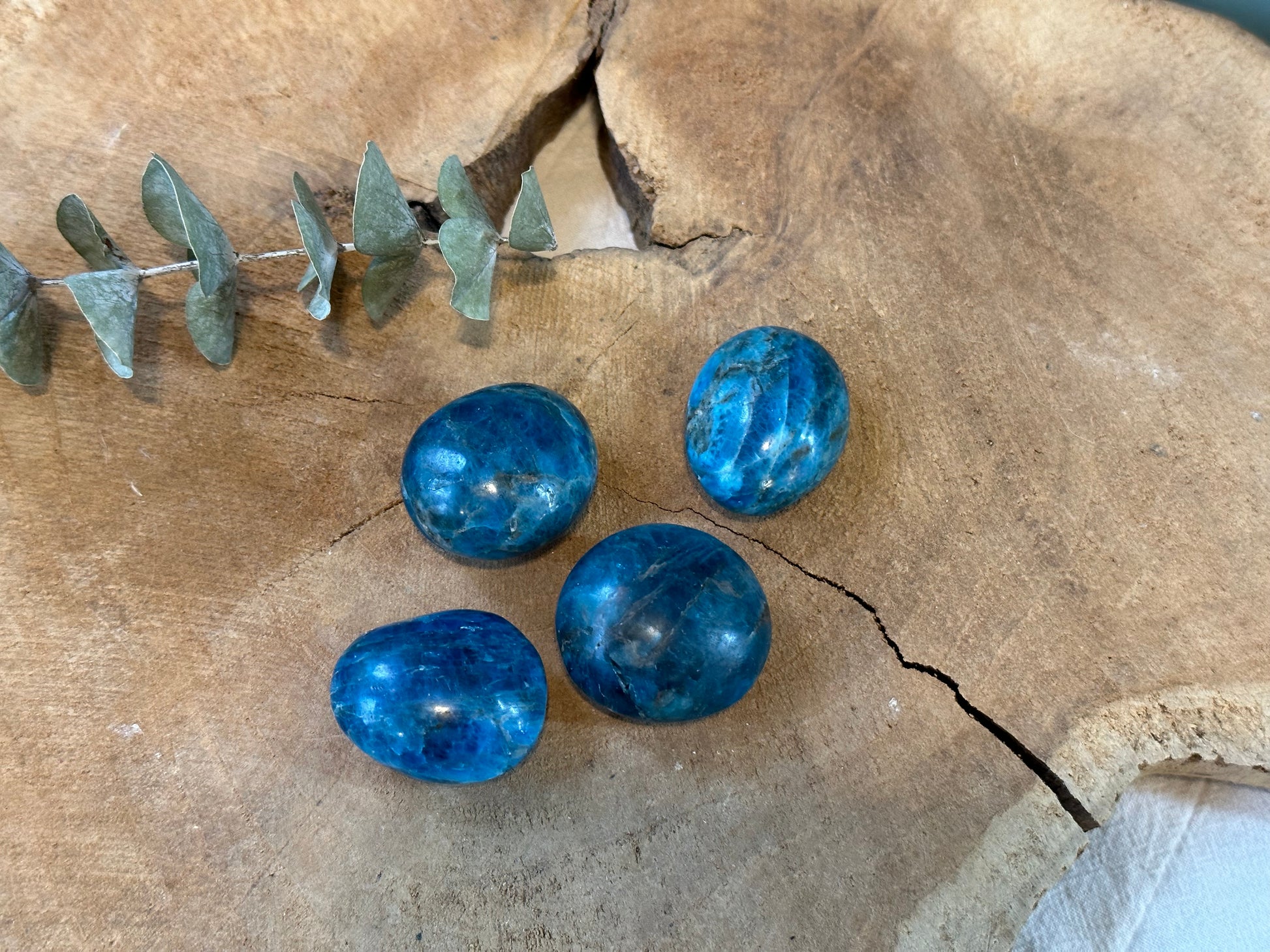 Zaksteentjes van apatiet, gemiddeld formaat 3 cm. Handig voor in je (broek)zak om mee te nemen en samen te gaan werken in energie.