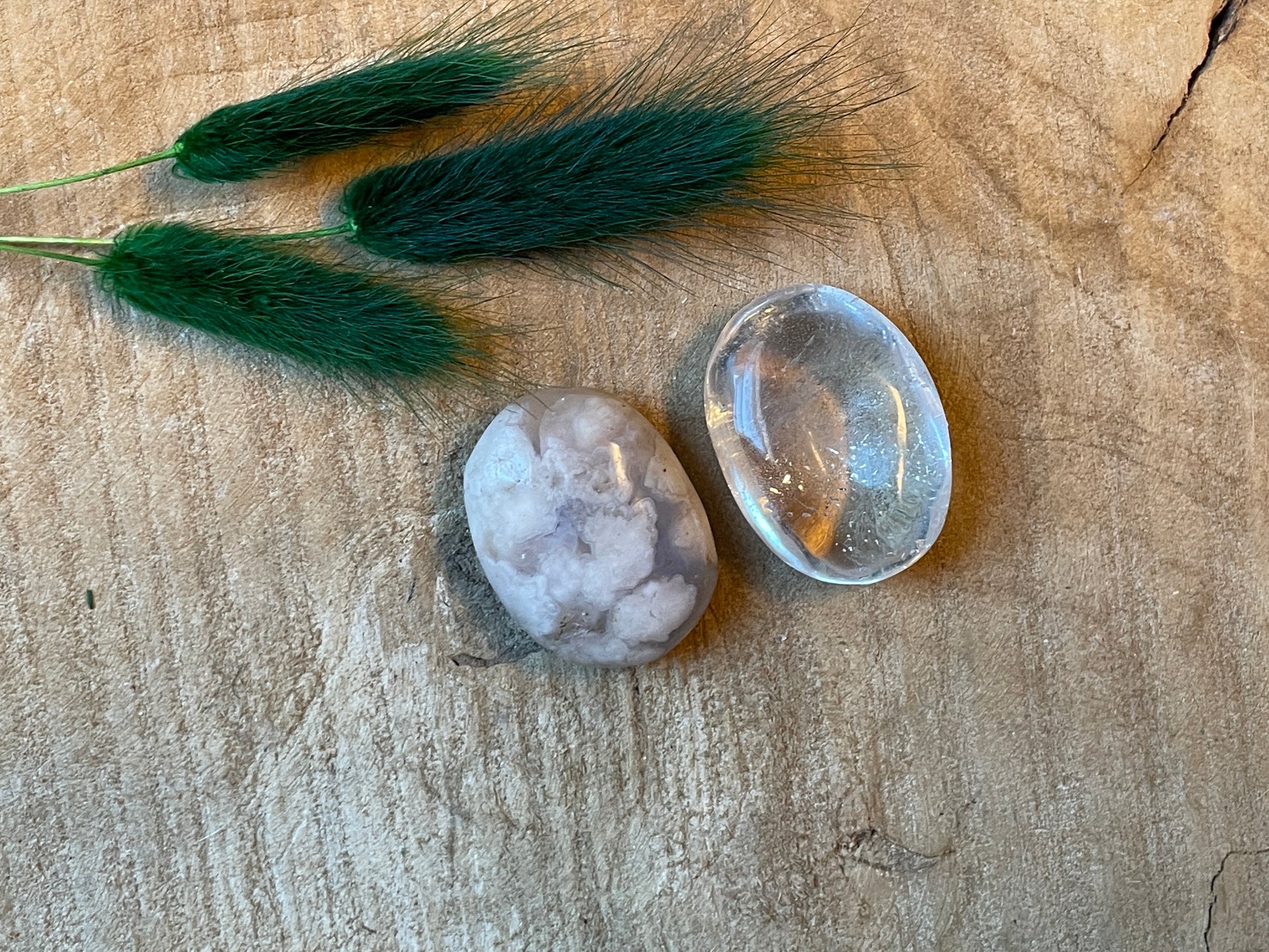 Zaksteentje van bergkristal, 2-3 cm groot. Hier op de foto zie je hem samen met een zaksteentje van flower agaat (bloemagaat)
