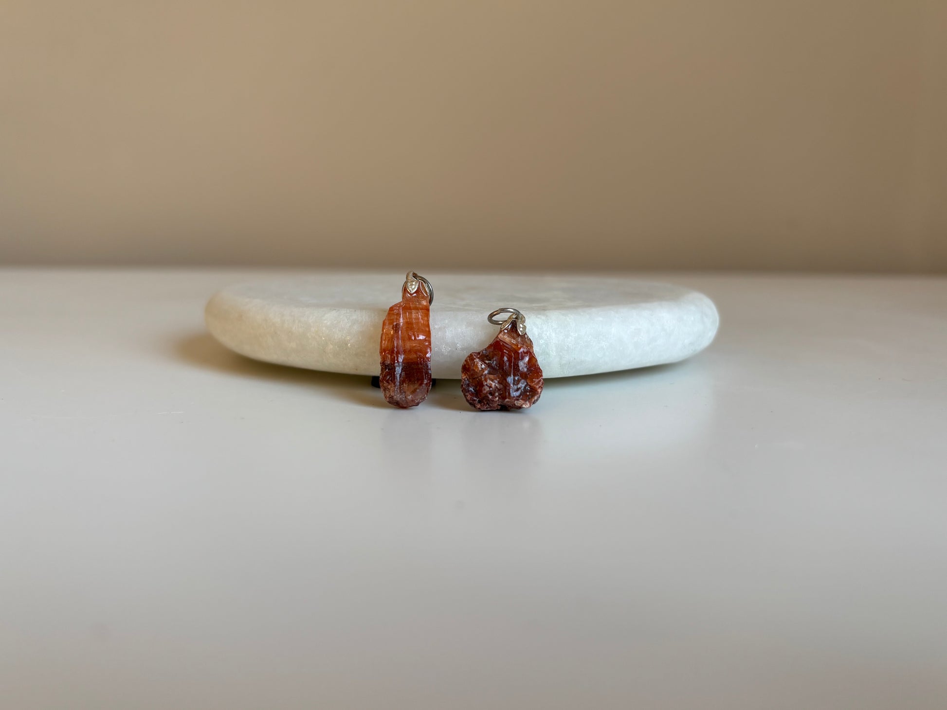 Rode calciet hangers, circa 1 cm groot.