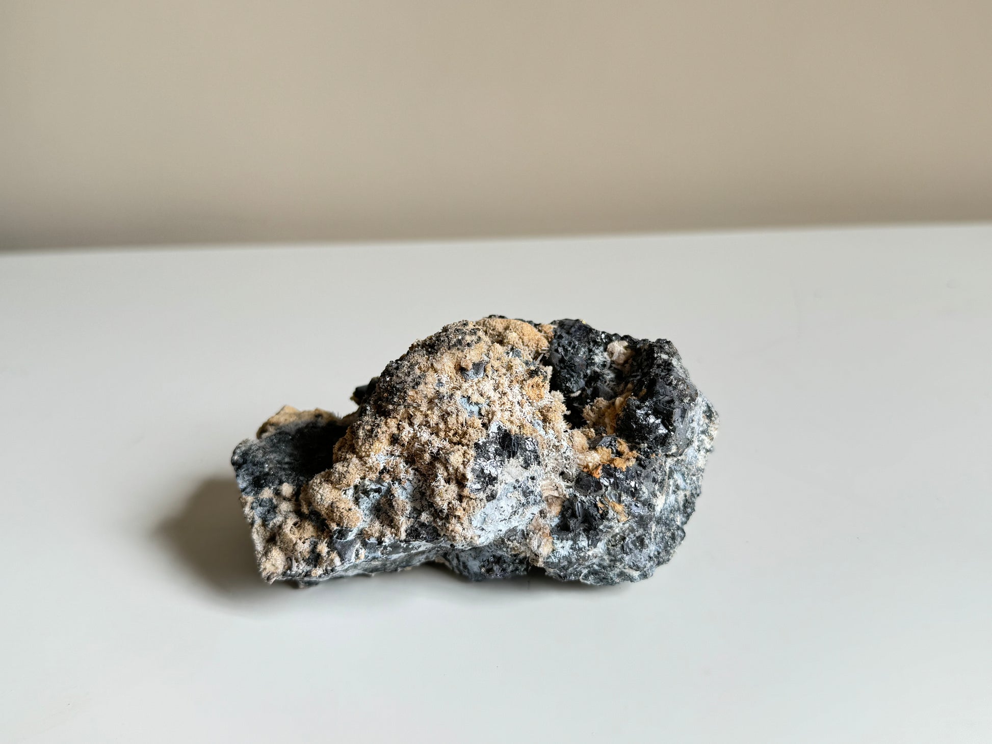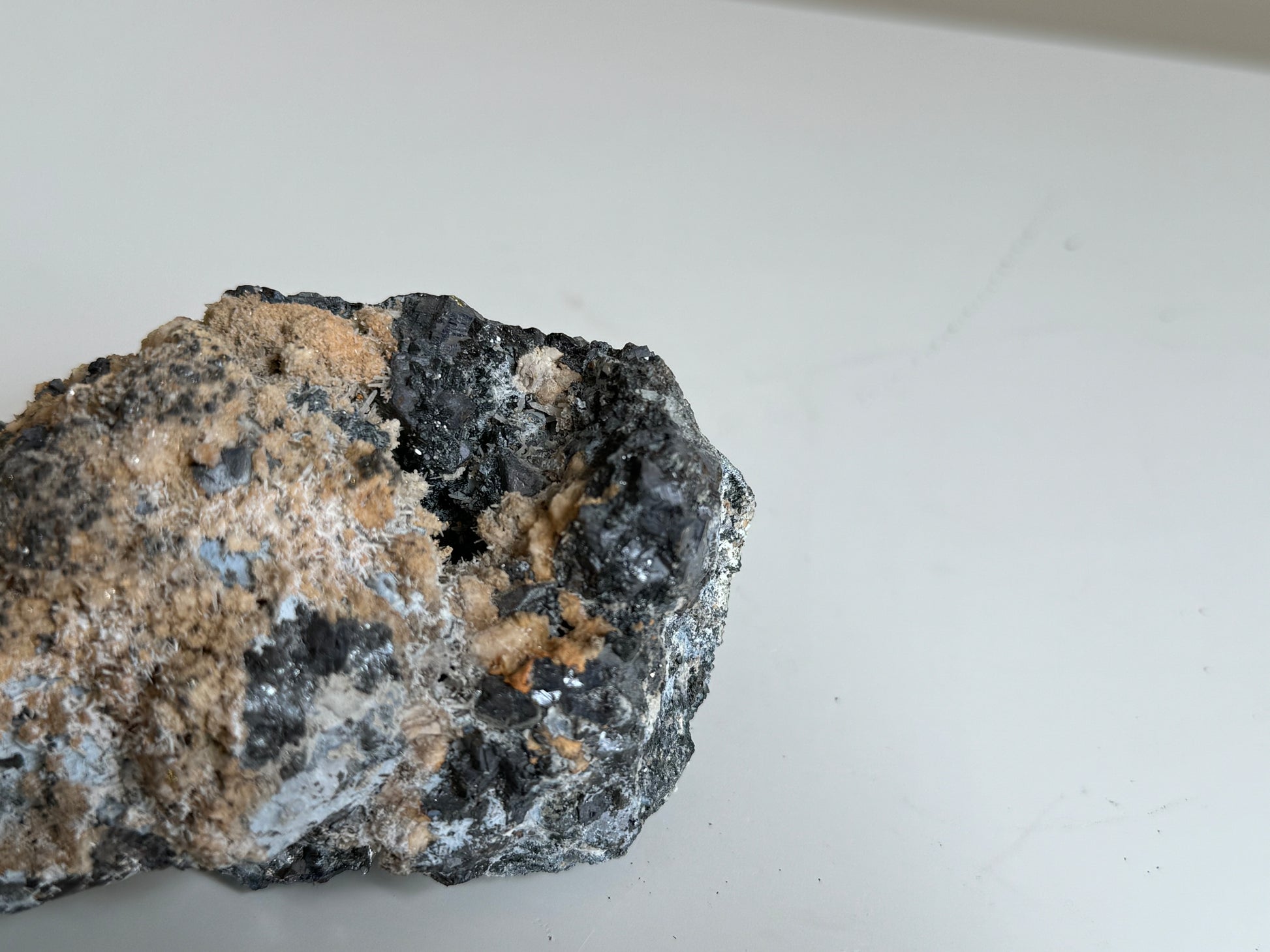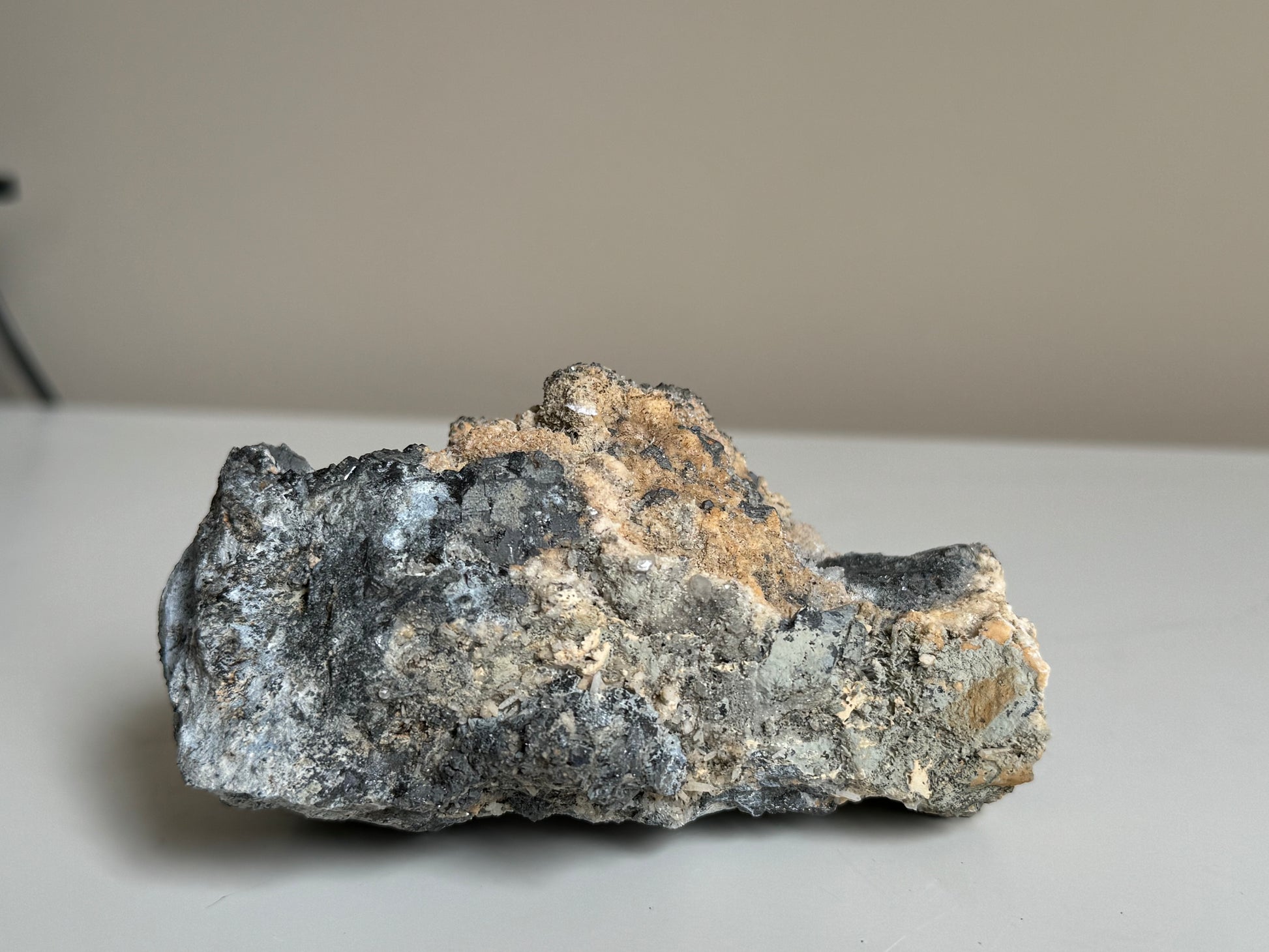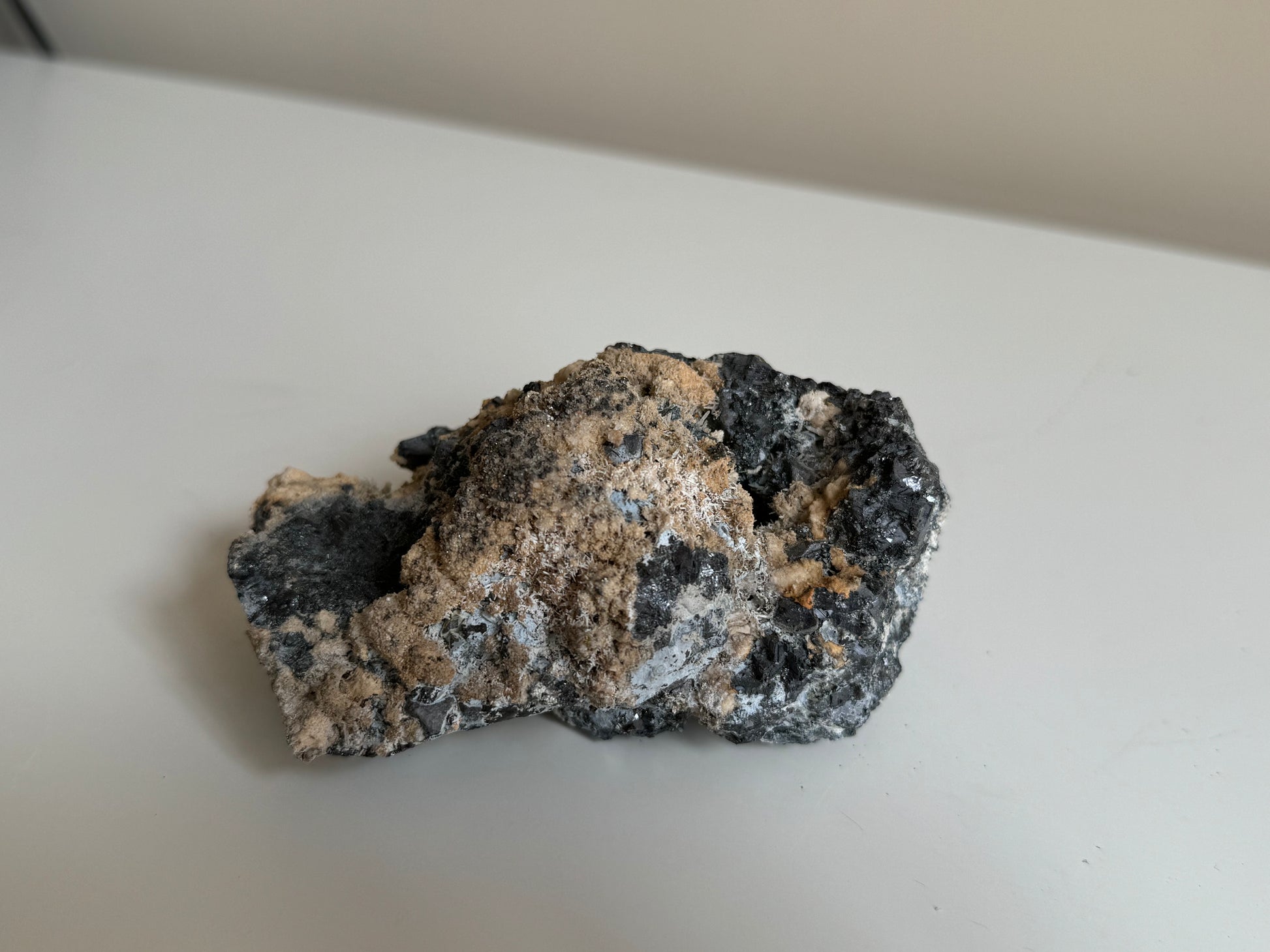 Ruw stuk hematiet met kwarts. Hij is 780 gram, 11 cm lang en 7 cm breed.