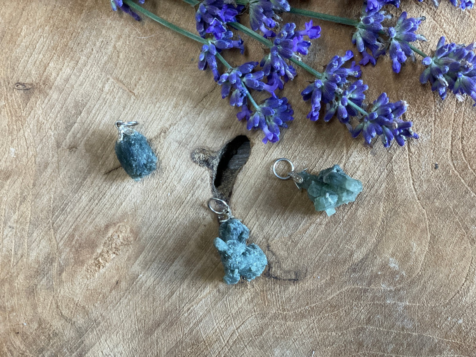 Een hanger van een gekristalliseerd stukje Prehniet van ca. 1-2 cm.