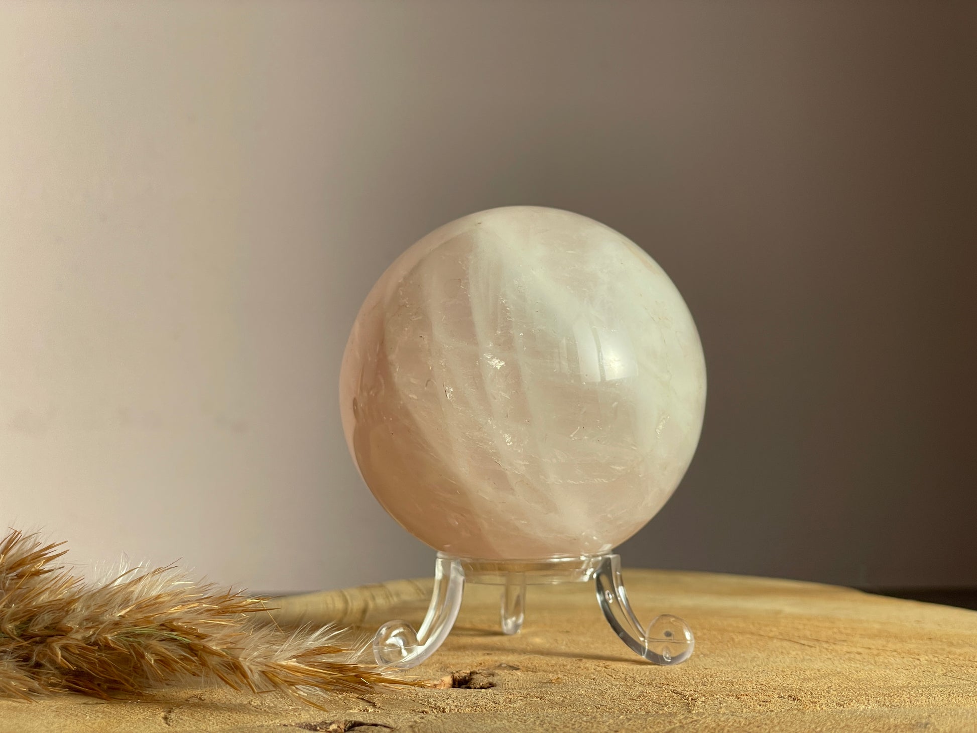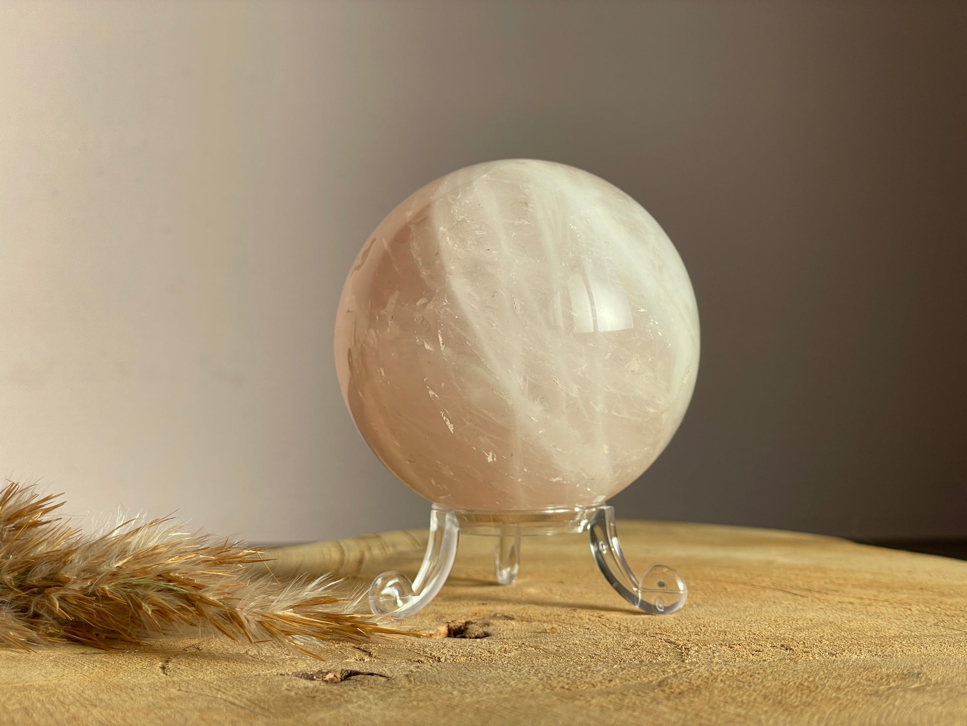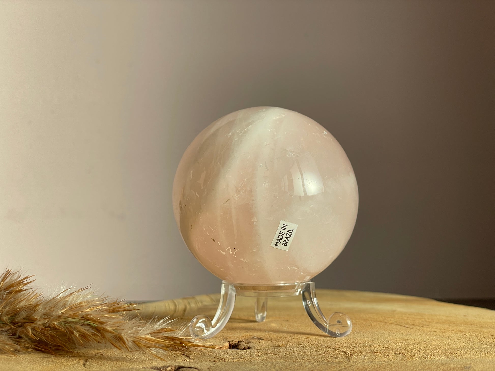 Mooie bol rozenkwarts. Heeft een doorsnede van 6,5 cm en weegt 399 gram.