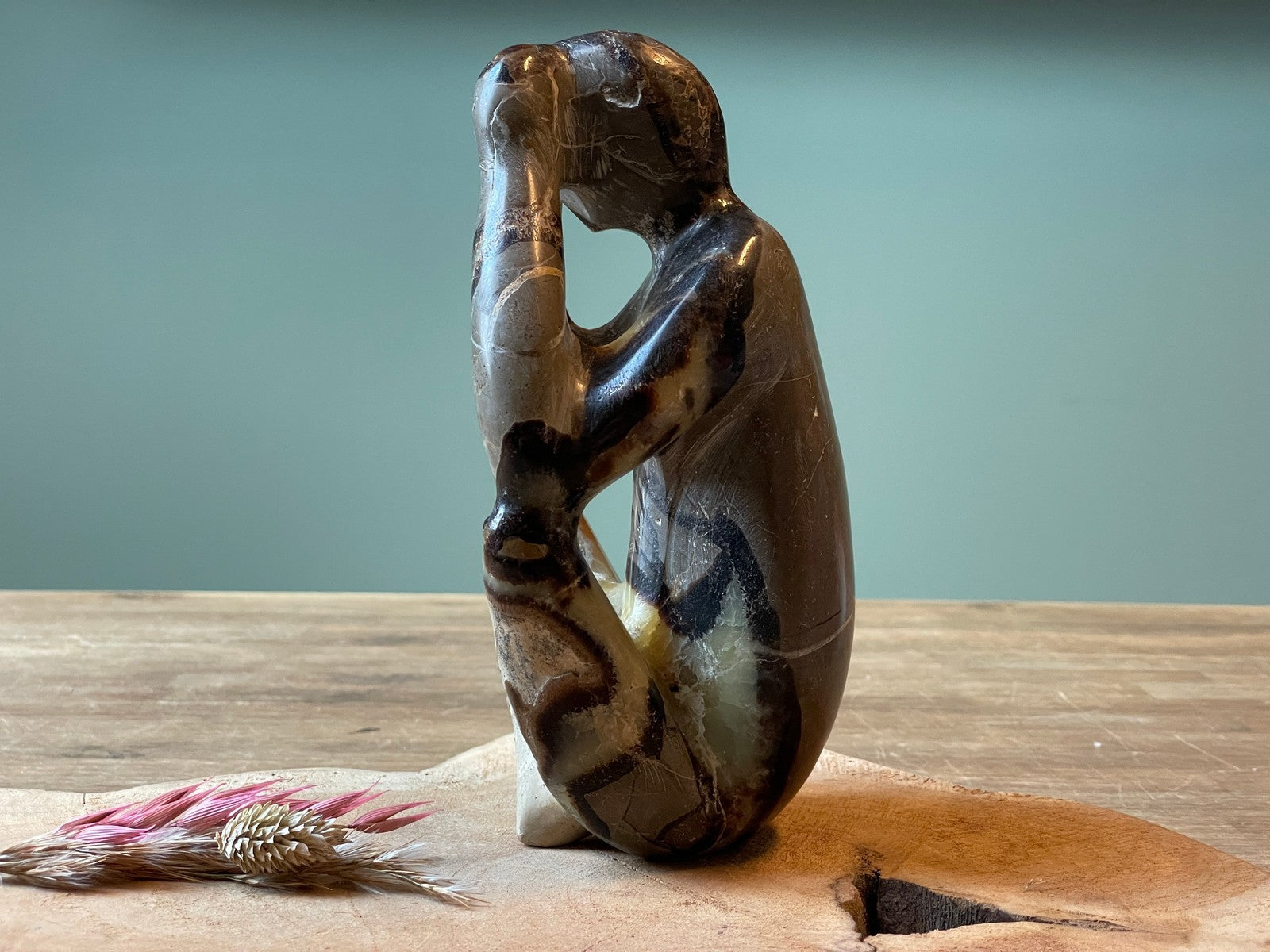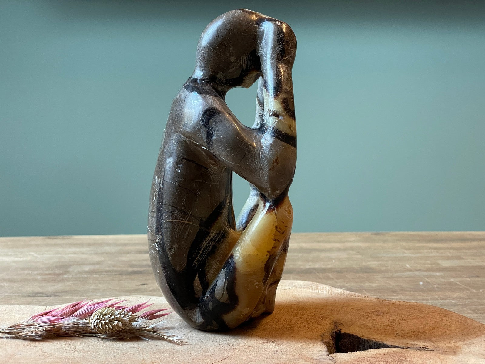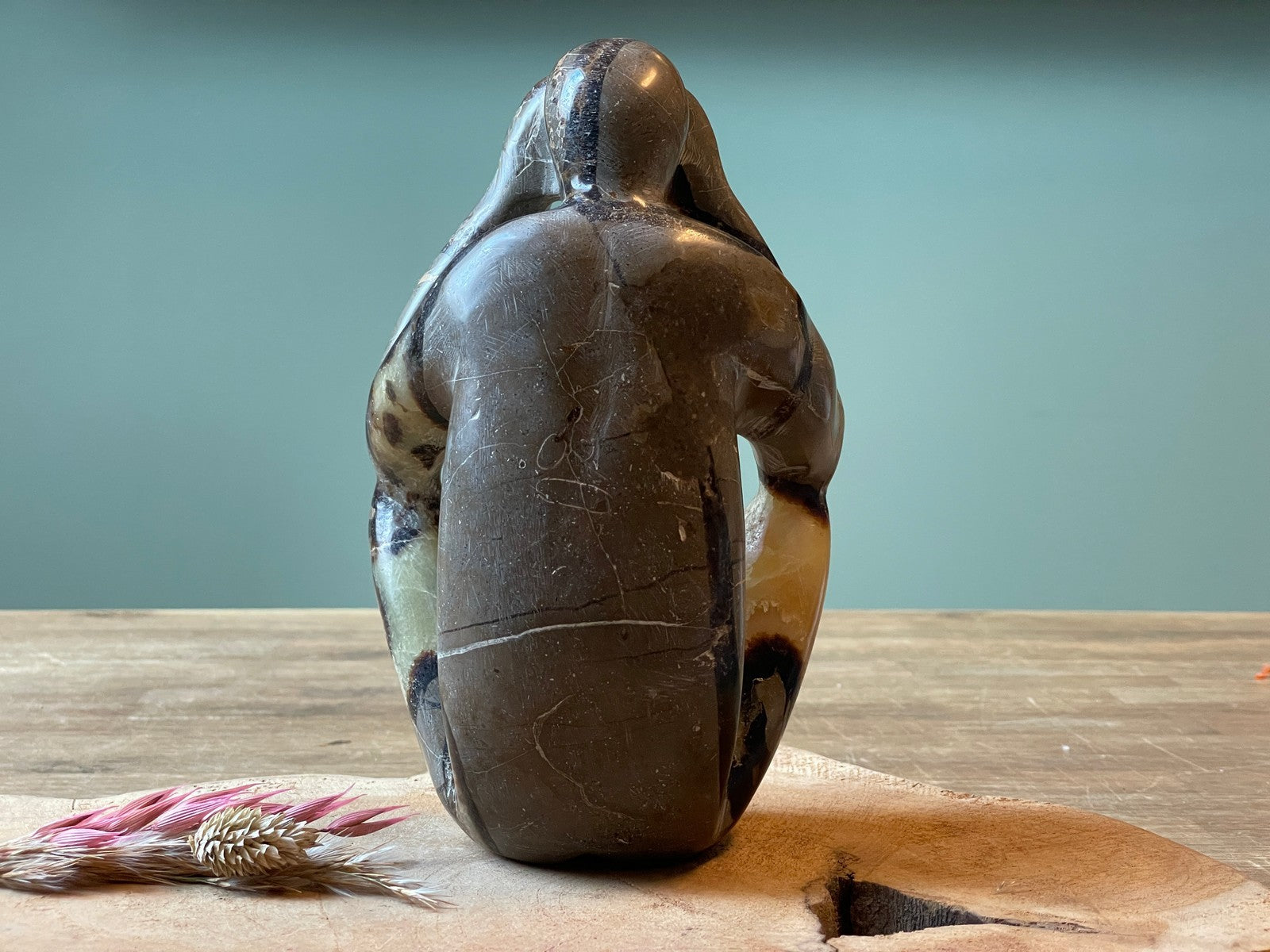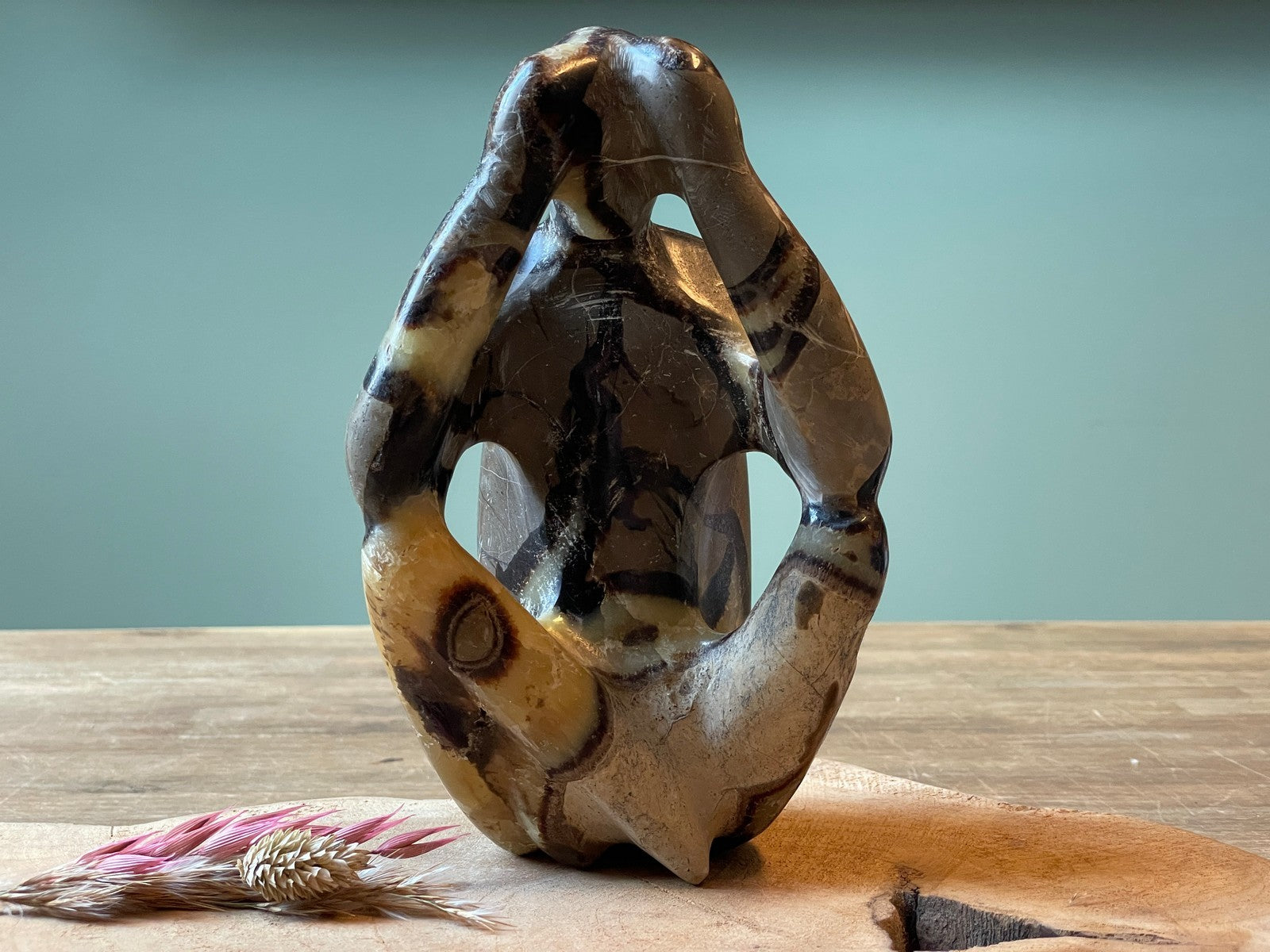 Sculptuur van septarie. Hoogte 18 cm, breed 12 cm en een gewicht van 1594 gram.