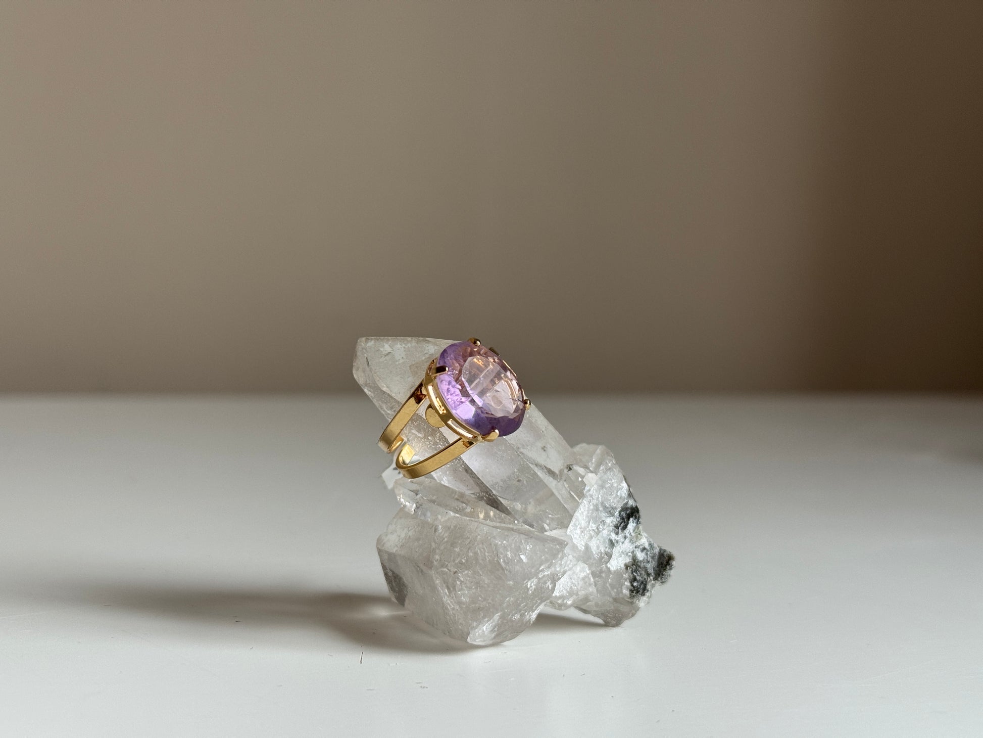 Amethist is traditioneel een symbool van innerlijke rust, intuïtie en bescherming. Deze ring combineert dat met het comfort van verstelbaarheid en de luxe uitstraling van verguld goud. Geschikt voor dagelijks dragen of als bijzonder cadeau. Houd de ring bij voorkeur droog en vermijd contact met parfums en shampoo om de levensduur te verlengen.