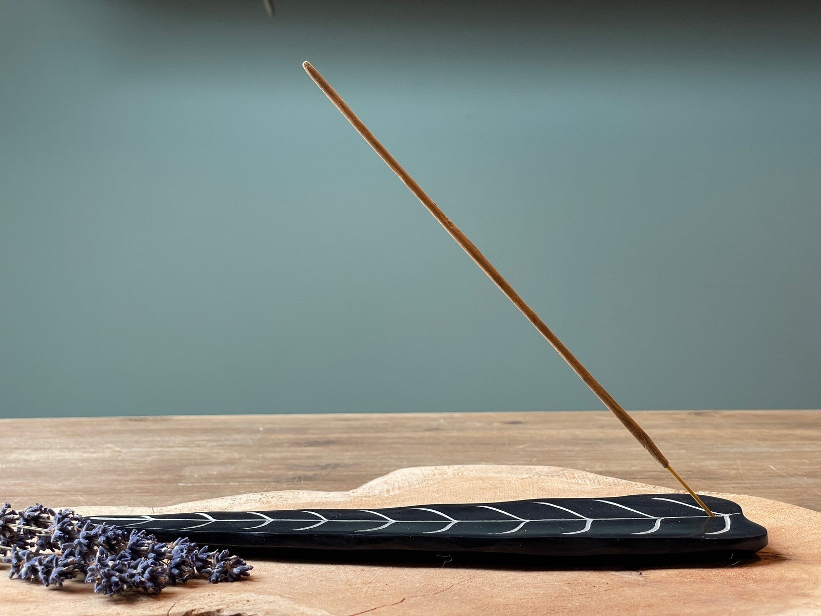 Wierookbrander in bladvorm. Zwart zeepsteen en een afmeting van 25 x 6,5 cm.